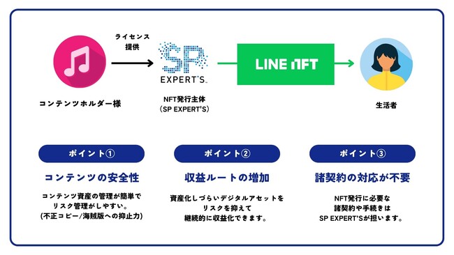 また、NFTを発行するうえで必要になる様々な法的要件に関しても既に整備しており、セールスパートナーとしてSP EXPERT'SがLINE NFT発行に関わるあらゆるフォローを提供できるため、各コンテンツホルダーが個別に複雑な法的契約やマーケット対応等を行う必要がなく、簡単に、かつ安心してLINE NFTをご活用いただくことが可能です。