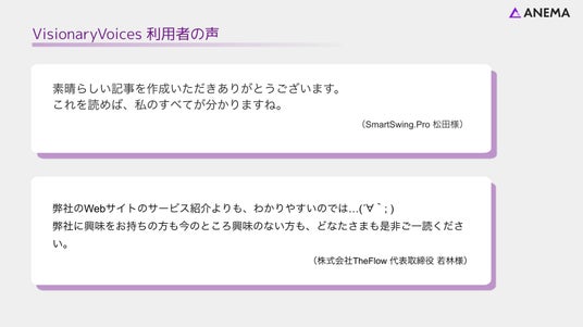 株式会社アネマ(オフィス:岐阜県大垣市、代表取締役:廣山晃也)は、企業のキーパーソンの想いや価値観を発信する「VisionaryVoices」のインタビュー記事作成サービスを、通常10万円のところ半額の5万円で提供するキャンペーンを開始いたしました。
