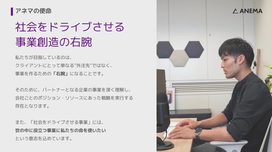 株式会社アネマは、SEOをはじめとするWEBメディア運用と採用マーケティングを支援する会社です。「納品物をつくらず、プラットフォームをつくろう」を掲げ、不必要な提案や形だけの納品を一切せず、クライアントが目指す未来を一緒に実現できるような「事業創造の右腕」になることを大切にしています。上場企業でのメディア運用経験を持つメンバーが中心となり、実践から得られた知見を基に、クライアントのニーズに合わせた効果的なマーケティング戦略の立案と実施を行っています。
