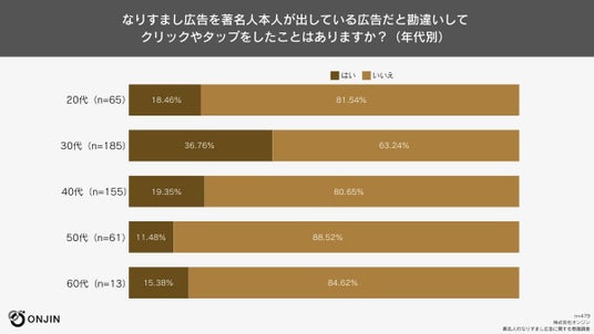 なりすまし広告を著名人本人が出している広告だと勘違いして、クリックやタップをした割合が最も高い年代は30代となっています。