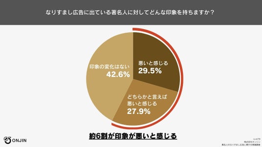 - なりすまし広告に出ている著名人に対して印象が悪いと感じる割合は57.4%。