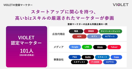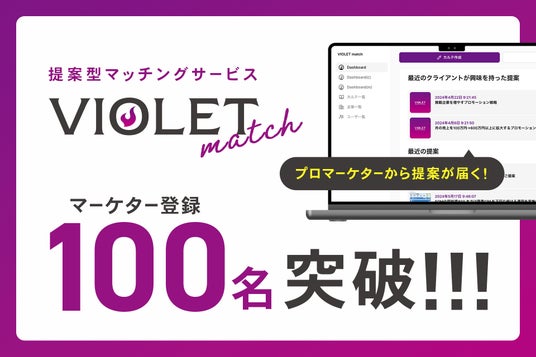 株式会社VIOLET(本社:東京都渋谷区、代表取締役:稲葉典之)は、プロマーケターの登録者が100人を突破したことを機に、独自の提案型マッチングプラットフォーム「VIOLET match」をシリーズAからCのスタートアップ企業に無償で提供することを発表します。