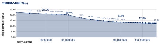 「運用額10%+運用管理費」。広告運用費に応じて対運用額の報酬比率(%)が低減していく料金体系です。
