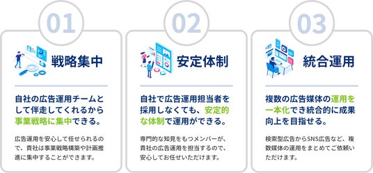 https://procmo.co.jp/adcmo/1. アドクモサービス利用企業のベネフィット伴走型で広告運用を行うアドクモサービスにより、クライアント企業は広告運用担当者を採用しなくても安定的な運用成果を上げることができ、