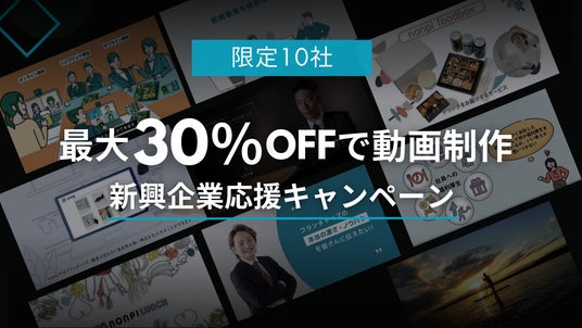 今の時代、企業のサービスや商品の魅力を言葉だけでなく映像で表現することは必須のコミュニケーション手段だと考えています。しかしながら、特に設立したばかりの会社は費用面の問題で動画を作れないことがよくあります。そのような会社を応援したく、今回特別に動画制作を30%オフで提供するキャンペーンを始めることにしました。これから成長していく企業が自分たちの夢や商品を多くの人に知ってもらう手助けができたら幸いです。