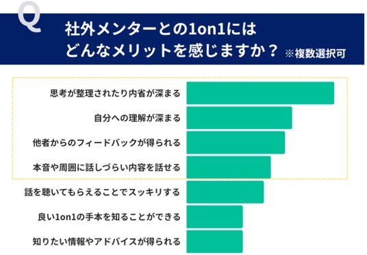 「社外メンターとの1on1には、どのようなメリットを感じますか?」の設問に対し、回答者の95%が「思考が整理されたり、内省が深まる」を選択。他上位項目については「自分への理解が深まる」「他者からのフィードバックが得られる」「本音や周囲に話しづらい内容を話せる」といった回答がありました。