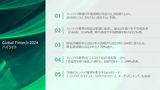 - フィンテック業界のビジネスモデルは「成長第一」から「収益性を伴う成長」へ移行し、EBITDAマージンが9%改善。