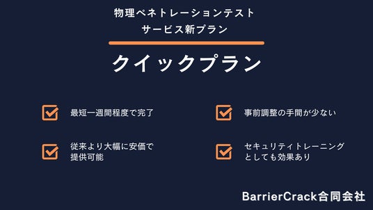 国内で唯一*物理ペネトレーションテストサービスを専門に提供するBarrierCrack合同会社(本社:東京都渋谷区)は、新プランである