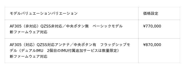 今回の改定により、「QZSS非対応モデル(中央ボタン無)ベーシックモデル」に加えて、新たに「QZSS CLAS対応アンテナ(中央ボタン有)フラッグシップモデル」を正式ラインナップとして追加します。フラッグシップでモデルのセットには、数量限定でデュアルIMUが無料サービス。通常は別売りとなります。