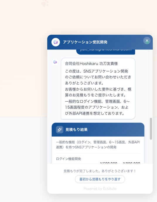 合同会社HoshikaruWebサイトにAI見積もりチャットを埋め込み。24時間365日、ヒアリングから内訳付き見積もり生成まで完全自動対応。