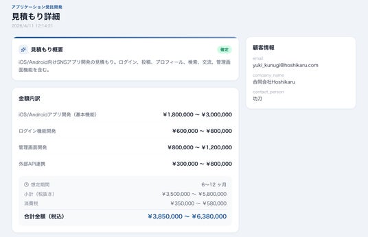 AIが自動生成した見積もりの詳細。金額内訳・想定期間・顧客情報をひと目で確認