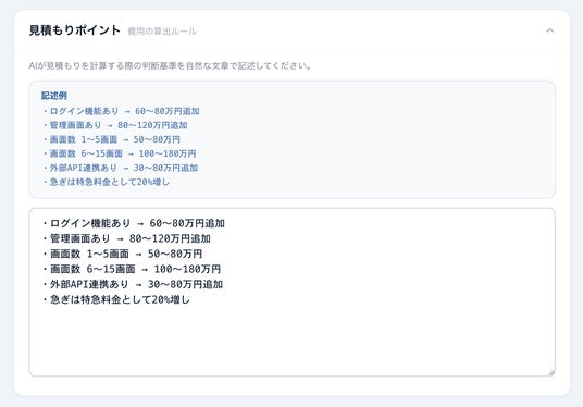 自然な日本語で料金ルールを記述するだけで、AIが自動的にルールを理解し、見積もりに反映します。