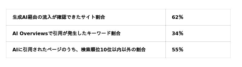 このように、AI検索では「順位が高い=引用される」とは限らず、情報構造や網羅性、一次情報の有無、定義の明確さなどが露出機会に影響しやすいことが分かっています。