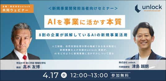 新規事業開発支援を行う株式会社unlock(東京都渋谷区、代表:津島越朗)は、4月17日(水)12時から、「AIを事業に活かす本質」をメインテーマに、8割の企業が誤解しているAIの新規事業活用における“ワナ”、そしてその解決策を紐解くオンラインセミナーを開催します。