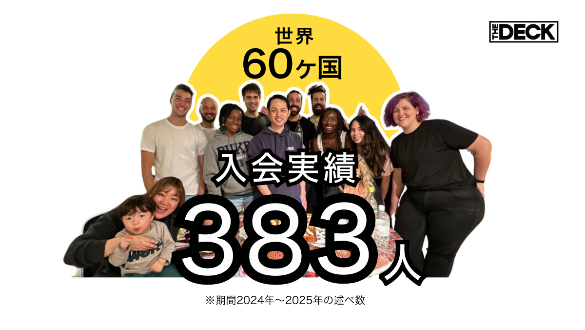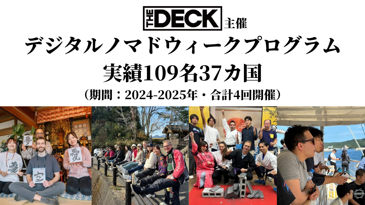 「本プログラムのゴールは、参加者が10日後に『ただいまと言える友人』を作り、大阪に確固たるベース(拠点)を築くことです。世界中を自由に移動するデジタルノマドにとって、The DECKがビジネスと人生の最高のパートナーになれると確信しています。日本と世界が交差するこの熱狂の10日間に、ぜひご参加ください!」