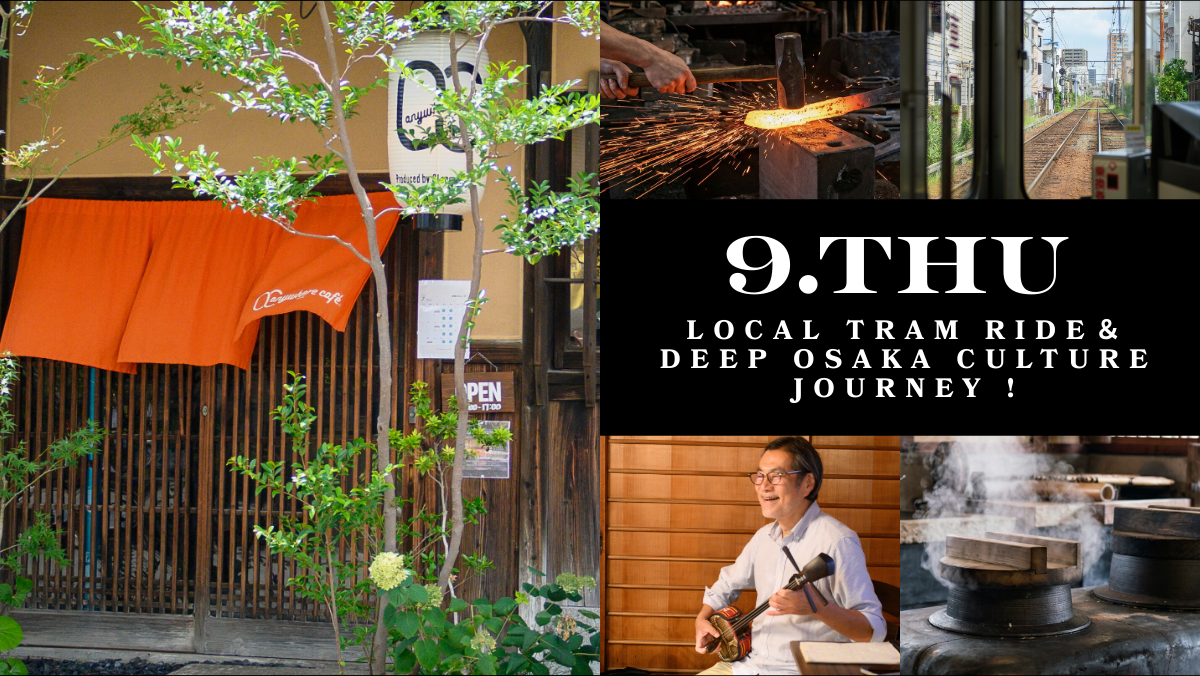 【メインイベント】ディープ大阪フィールドワーク&古民家大宴会(4/9)レトロな路面電車に乗り、千利休ゆかりの地「堺」へ。伝統的な刀鍛冶の見学や、堺の包丁技術を極めたフランス人職人との対話を実施。夕方からは古民家カフェ(anywhere cafe)にてかまどでご飯を炊き、「三線(さんしん)」の生ライブとともに大宴会を開催。