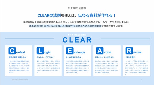 CLEARの法則は我々が資料構成案を作るうえで最も大切にしていることです。この考え方を常に頭の片隅において資料構成を考えるとクオリティが格段にあがります。