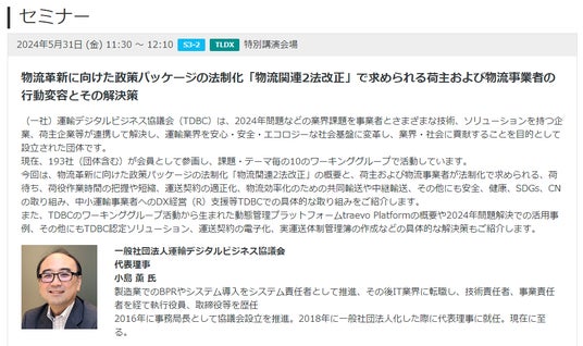 また、一般社団法人運輸デジタルビジネス協議会(以下、TDBC)への参画も含め、様々な取り組みや制度の動き、新しい技術を知ることで、これから向き合う必要があるDXにも向き合う心構えを語っていただいた。そのうえで、SDXCおよびTDBCの最新動向についてお知らせする。
