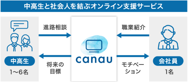 株式会社すみかが開発するオンライン進路相談サービス「canau」は、社会人と中高生がオンラインで対話と進路相談を行うことで、双方に新たな気づきとモチベーションアップをもたらすことを目的とした、対話型越境キャリアプログラムです。2022年度夏休みには3校/28社で導入し、148名の生徒が「canau」を通して進路相談を実施(実績の詳細はこちら: