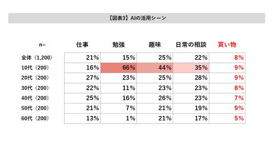 直近3か月以内のAI活用目的を見ると、年代によって傾向に違いが見られました。特に若年層では、勉強、趣味、日常の相談事など、複数のシーンでAIを活用しており、活用範囲が広いことが特徴です。【図表3参照】