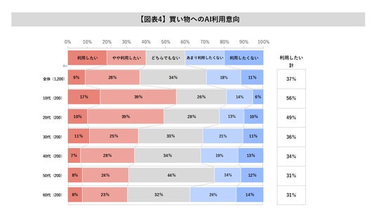 一方で、買い物やそのための情報収集にAIを「利用したい」「やや利用したい」と回答したのは全体でも37%、若年層では半数近くにのぼっています。【図表4参照】