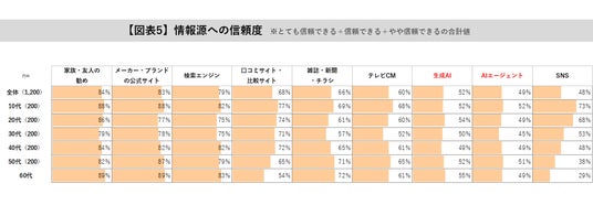 また、生成AI・AIエージェントを「とても信頼できる」「信頼できる」「やや信頼できる」と回答したのは全世代で約50%と、SNSと同程度の水準でした。テレビCMに次ぐ信頼度といえます。【図表5参照】
