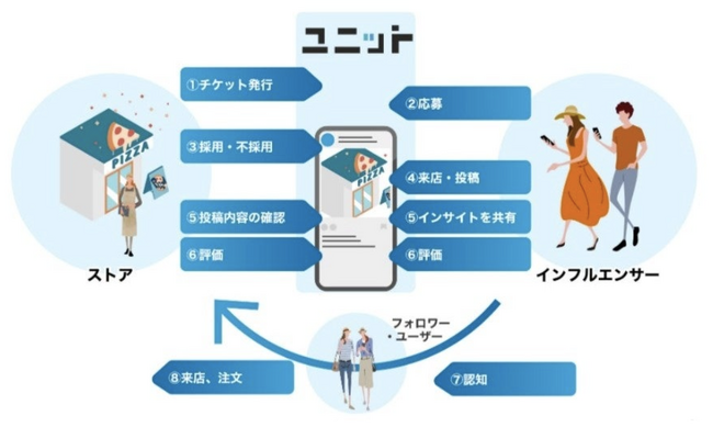 ユニットは、グルメに特化させ、かつ登録店舗の近隣のインフルエンサーにアプローチが可能です。そのため、最重要である来店に直結します。ご利用いただいた店舗が反響や売上を実感できる仕組みです。