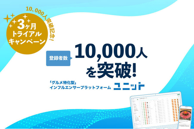 株式会社UNIT”グルメ案件”に特化したインフルエンサープラットフォーム『ユニット』がインフルエンサー登録者数1万人を突破。これを記念し、トライアルキャンペーンを開催。