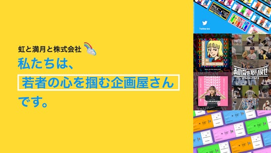 虹と満月と株式会社は、若者の心を掴むのが得意な企画・マーケティング会社です。主にF0/1層、M0/1層(Z世代)に特化しており、既存の概念を変える企画で「シェア」され、多くの人が「賛同」し、新たな「文化形成」を起こすコンテンツをつくるのが得意なZ世代集団です。「イケてるメンツたちとイケてるクリエイティブで地球を沸かせる」をビジョンに掲げ、さまざまな企業・行政と共創を実施しています。