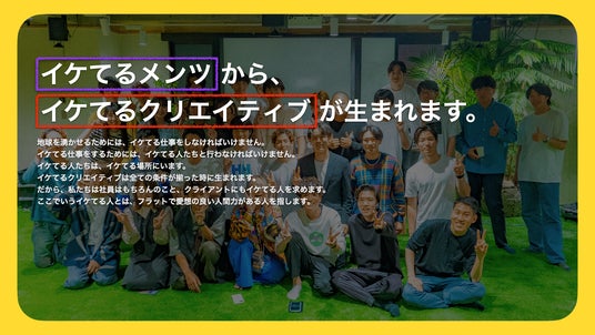 大企業出身やトップクリエイターのバックグラウンドを活かし、オンライン・オフラインを問わない企画立案からPR設計、ブランディング戦略、SNS運用までをオールインハウスでワンストップで担当いたします。また、満月休暇やイイやつ採用、なんでもやろうよ制度など、楽しくウェルビーイングに働くことができる方法にも積極的に挑戦しています。