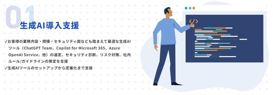 01 生成AI導入支援・お客様の業務内容・規模・セキュリティ面なども踏まえて最適な生成AIツール(ChatGPT Team、Copilot for Microsoft 365、Azure OpenAI Service、他)の選定、セキュリティ診断、リスク対策、社内ルール/ガイドラインの策定を支援