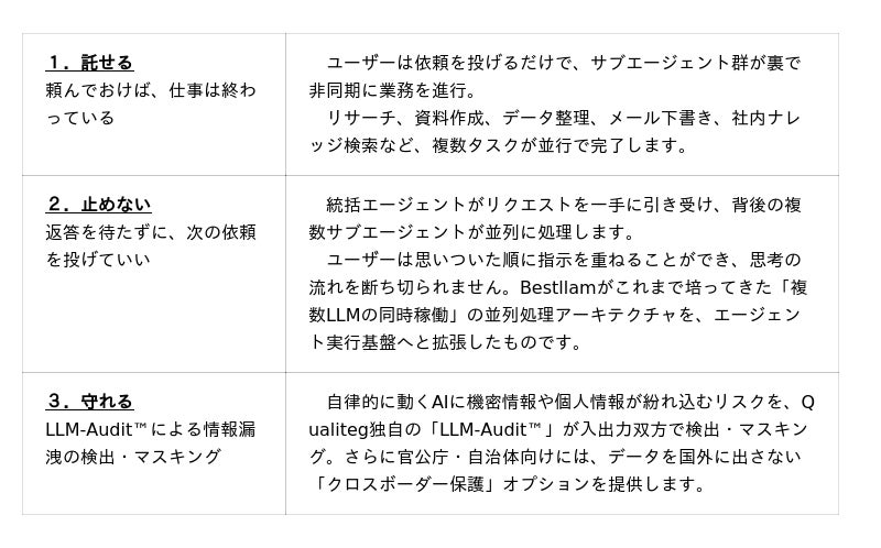 株式会社Qualiteg「Bestllam(R)」に、AIエージェント機能を搭載 ― 依頼は並列に、思考は止めず。日本企業の業務システムに溶け込む“働くAI”へ ― 生成AI導入・AIエージェント・業務自動化・コンサルティング