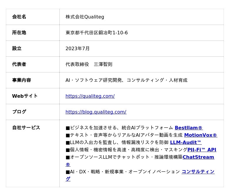 株式会社Qualitegは、2023年7月に設立されたAIカンパニーです。「世界中の人々のクリエイティビティを深化させる」という経営理念のもと、最先端のAI技術を通じて、技術的障壁や言語の壁、身体的制約を取り払い、すべての人が持つ創造的な潜在能力を解放することを目指しています。