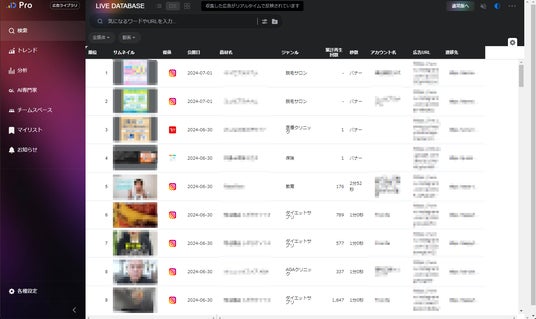 ■主な新機能最新広告がリアルタイムで反映:LIVE DATEBASE[Pro live]収集した広告がリアルタイムでAIが判別し、データベースに反映。これにより広告の収集数が10倍に!より豊富なデータとリアルな市場の動向を把握いただけます。