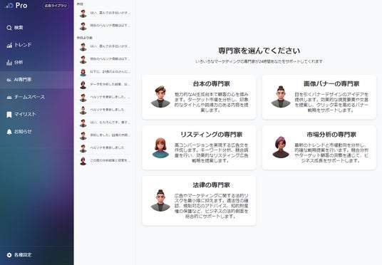 AI専門家機能台本の専門家、画像バナーの専門家、市場分析の専門家など広告クリエイティブを制作する上で必要な業務をAI専門家たちが全て解決してくれます。AIの大規模言語モデルの技術進化に伴い、AI専門家機能も共に進化していきます。