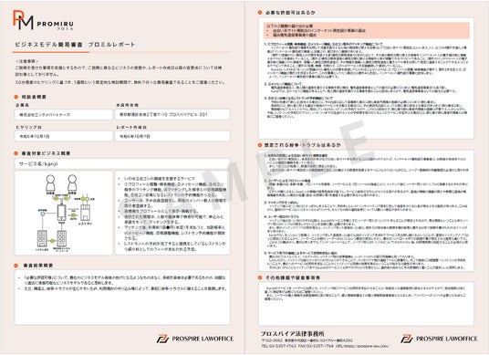 新規事業を始める企業向けに弁護士がビジネスモデルの適法性を審査し、必要な許認可や想定されるトラブル等をレポートにまとめて提供するサービスとなります。
