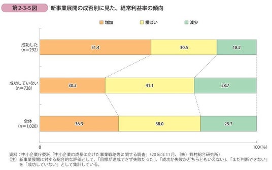 中小企業庁の調査によると新事業展開に成功した企業で経常利益率が増加傾向にあると回答した企業は51.4%であるところ、新事業展開に成功していない企業では30.2%となっており、会社経営において新規ビジネスの成否がいかに重要かがうかがえます。