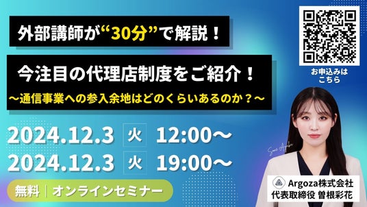 Argoza株式会社(本社:東京都千代田区、代表取締役:曽根 彩花)は、法人の新規事業やクロスセル商材に役立つ「今注目の通信事業に関する代理店制度」を30分で解説するオンラインセミナーを開催します。