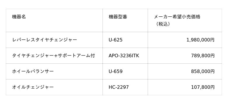 2.取扱い機器について車両の高性能化に伴い、大口径かつ低偏平なタイヤ・ホイールが増加しており、従来の機器では組み換えやバランス調整の対応が困難になっています。この需要に応えるため、自動化・高精度化された最新の機器に焦点を当て、タイヤチェンジャーを主力とし、各種メンテナンス機器の発売を開始いたします。