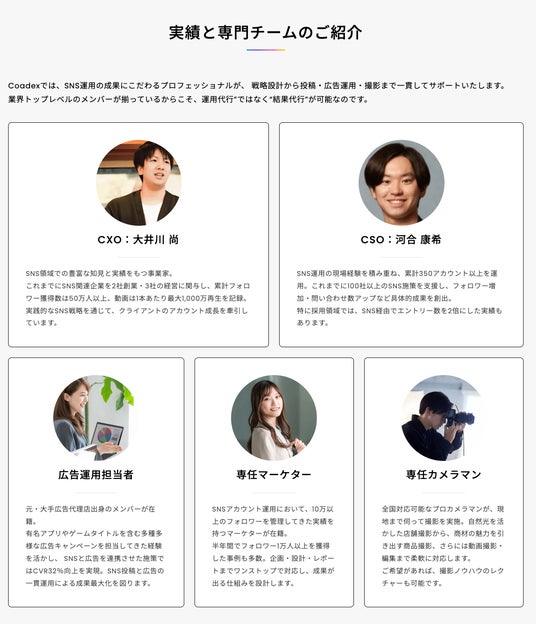 サービスの裏側で動くチームの顔や専門領域を紹介し、安心してご相談いただけるよう配慮しています。