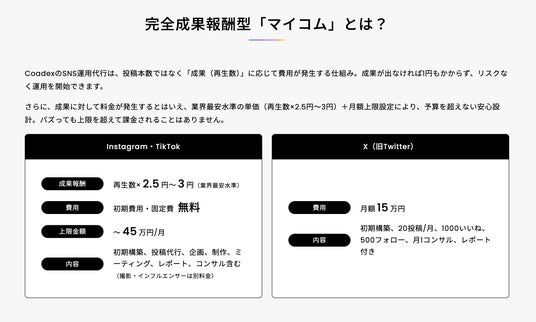 InstagramやTikTok、X(旧Twitter)などを活用したSNS運用を、企画・撮影・投稿・レポートまでワンストップで支援。完全成果報酬型のプランもご用意しており、リスクを抑えながら始められます。