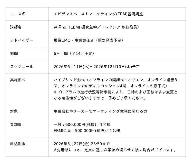 一般社団法人日本エビデンスベーストマーケティング研究機構(所在地:東京都中野区、代表理事:木田 浩理、以下 EBMI)は、エビデンスベーストマーケティング(EBM)の基礎を体系的に学ぶ「エビデンスベーストマーケティング(EBM)基礎講座」の第2期を2026年6月より開講します。