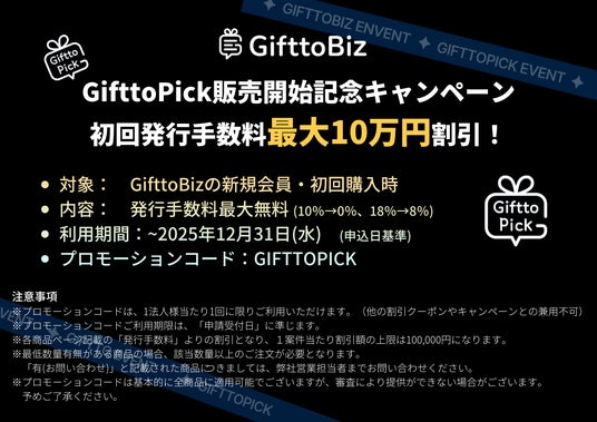 GifttoBizの新規会員を対象に、初回購入時の発行手数料を最大10万円割引するキャンペーンを実施いたします(2025年12月31日まで)。