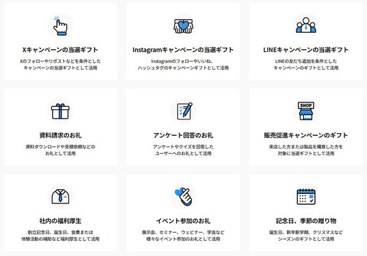 GifttoPickは様々なシーンでご活用いただけます。X, Instagram, LINEなどのキャンペーンの当選ギフト、資料請求のお礼、アンケート回答のお礼、販売促進キャンペーンのギフト、社内の福利厚生、イベント参加のお礼、記念日・季節の贈り物など、幅広いシーンで、施策の目的・予算に合わせてご活用いただけます。