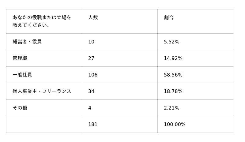 【 調査概要 】あなたの性別・年齢・業種・従業員規模・役職について教えてください。【 選択肢 】▼性別