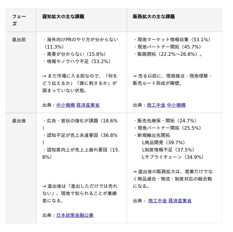 確保」「法規制・商習慣対応」「品質管理」「既存市場での拡販」に悩みが移る、という壁