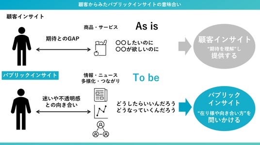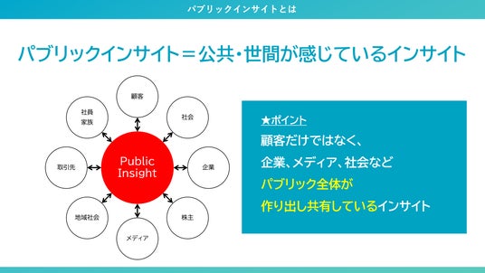 これまでの顧客インサイトが「商品・サービスへの期待」であり、これを理解して期待に応える商品・サービスを提供することで瞬間的な効果を生むものだとすれば、パブリックインサイトは「社会全体のモヤモヤを言語化し共感をもたらす」ものです。