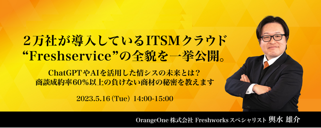 情シスDXをサポートする「Freshservice」を提供するOrangeOne株式会社(本社:東京都千代田区、代表:春日原 森)は、2023年5月16日(火)にオンラインにて販売店様向けセミナー「2万社が導入しているITSMクラウド“Freshservice”の全貌を一挙公開」を開催いたします。