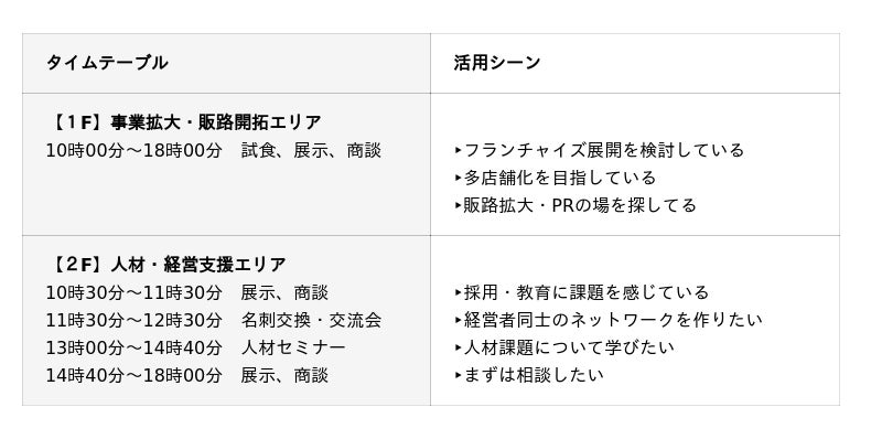 イベントは、中小企業が直面する「人材課題」「事業拡大」「FC展開」などのテーマに対し、専門家や関連企業との商談を通じて解決の糸口を探るものです。1階では、フランチャイズ本部や地方発ブランドなどが事業拡大向けの出展を行い、2階では、人材課題を支援する専門家が集結。SNS発信の専門家・西山ダディダディ氏(