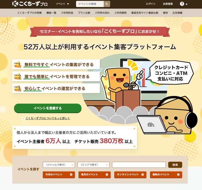 『こくちーずプロ』は、2009年より当社が運営しているイベントポータルサイト「こくちーず」を大幅拡張し、もっと使いやすく、集客力を更に向上させ2015年より稼働しているイベント集客プラットフォームです。登録料・手数料は無料で、現在、会員数は52万人を超えて成長を続けています。